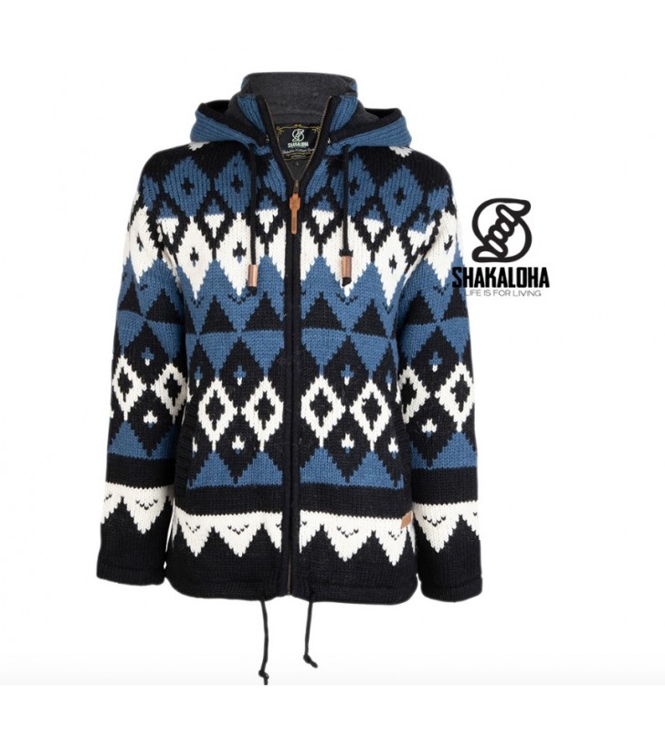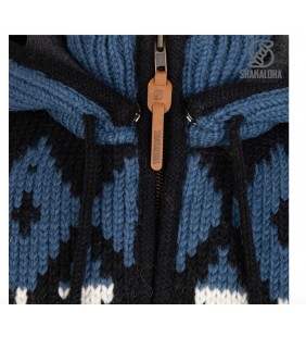 Gilet norvegese di Shakaloha realizzato in 100% lana di pecora e foderato in morbido e caldo pile. La giacca presenta una stampa norvegese in bianco e due tonalità di blu e ha un colletto e un cappuccio staccabili. Il gilet ha tasche laterali e una tasca interna con cerniera. La giacca è disponibile nelle taglie dalla S alla 3XL. I gilet Shakaloha sono realizzati in 100% lana di pecora neozelandese e sono prodotti in Nepal nel rispetto degli animali e dei lavoratori. I gilet possono essere lavati con un po' di detersivo per lana, con un ciclo per lana a 30 gradi.